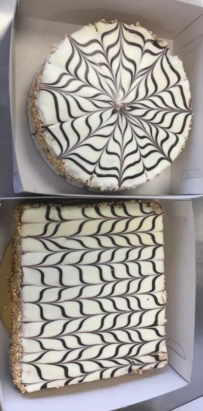 Die Torte besteht aus mehreren dünnen Schichten nussigem Biskuitteig, die mit einer zarten Buttercreme gefüllt sind. Die Oberfläche ist mit weiße Schokolade überzogen.