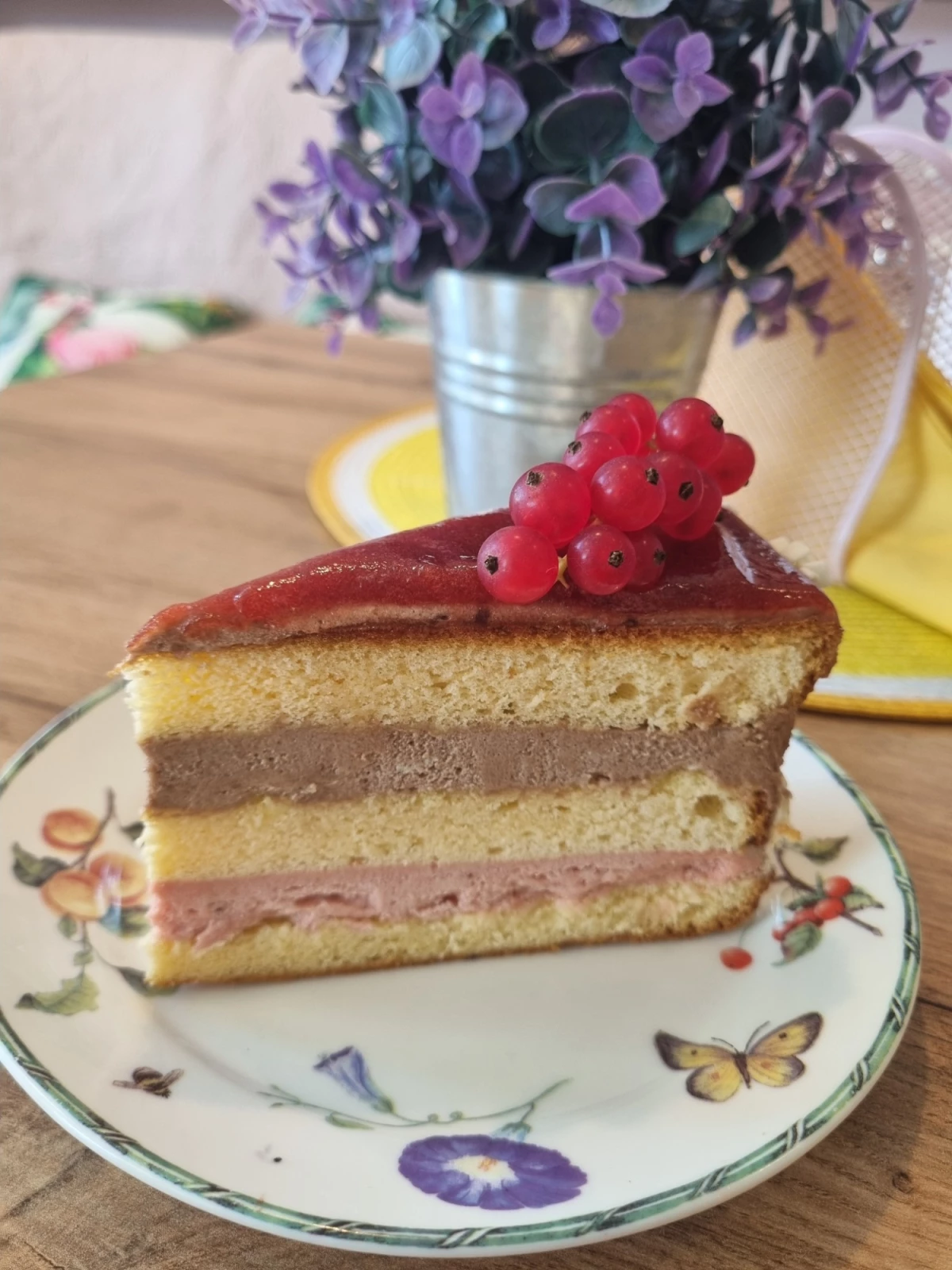 Die weichen Biskuitlagen werden durch eine Schicht fruchtige Erdbeerfüllung und eine Schicht Schokoladen-Mascarpone-Creme unvergesslich gemacht.