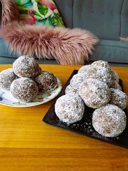 Eine köstliche Punschmasse aus Schokolade, Biskuit und Marmelade, sorgfältig zu Kugeln geformt mit Zitronenschale. Anschließend werden sie in Kokosflocken gewälzt