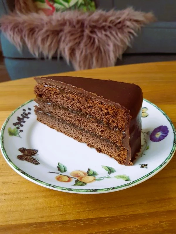 Sacher Schoko-Biskuit, gefüllt mit klassischer Marillenmarmelade 2x, und mit bitterem Sacherglasur überzogen.
