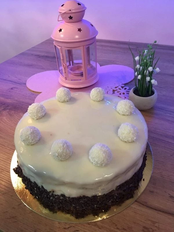 Kokosoberscreme auf einem weichem, hellem Biskuitboden, überzogen mit einer Schokoglasur, gekrönt mit einer Raffaellokugeln.