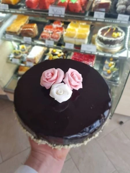 Ein zartes, schokoladiges Highlight! Die leichte, fluffige Schokocreme auf einem weichen, hellen Biskuitboden, überzogen mit zartbitterem Spiegel Schokoglasur. (Ohne Rosen)