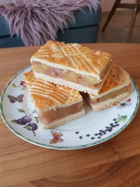 Zwischen zwei Schichten klassischem Mürbeteig befindet sich eine saftige Apfelfüllung mit fruchtigen Apfelstücken.