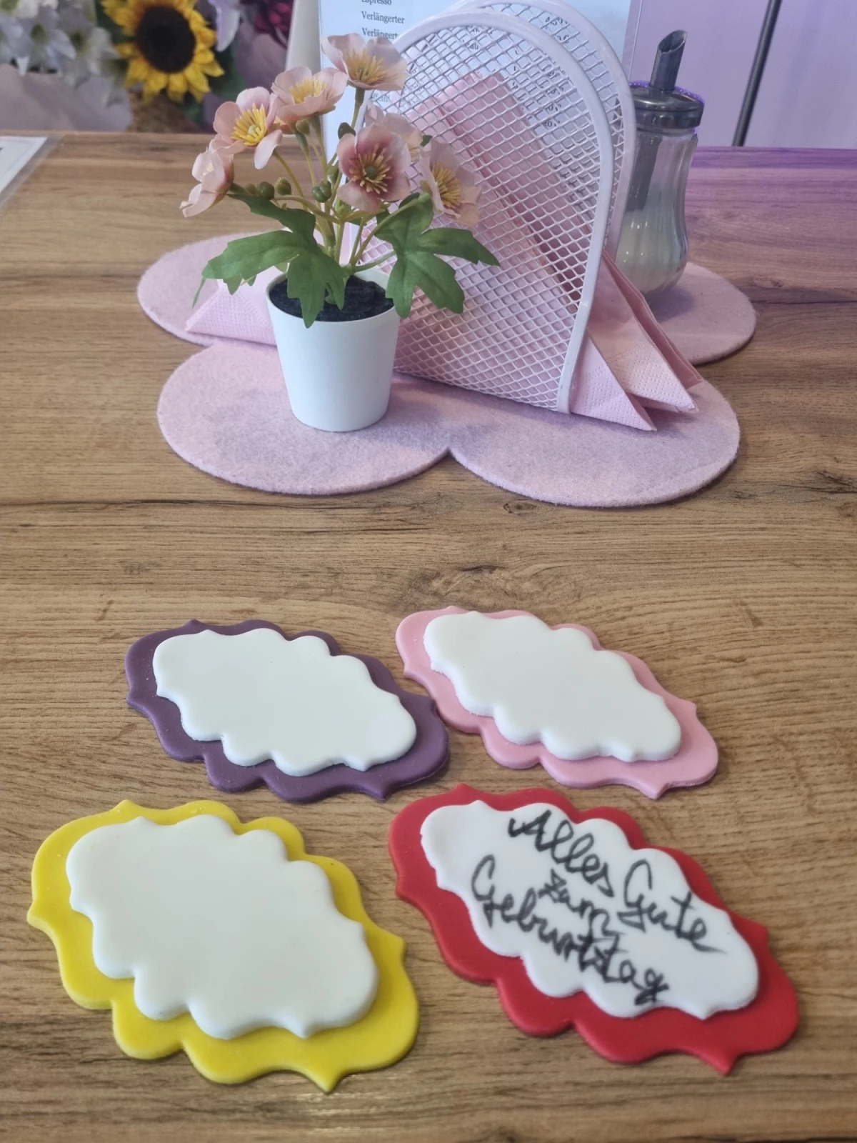 Die Beschriftung wird auf eine Zuckertafel (10 cm) aufgetragen und anschließend auf die Torte gesetzt.